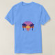 A serene and vibrant illustration of a sunset with two palm trees standing on the shore, reflecting on the calm water surface, creating a peaceful ambiance.
