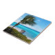 Ceramic tile with a scenic photograph. A clear blue ocean with a white sandy beach.