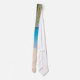 A tie with an idyllic tropical beach scene. Turquoise blue crystal clear water and a soft brown sandy beach. Some palm leaves hanging down from above. A serene and peaceful landscape.
