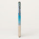A phone case with an idyllic tropical beach scene. Turquoise blue crystal clear water and a soft brown sandy beach. Some palm leaves hanging down from above. An old wooden rowboat sits on the beach. A serene and peaceful landscape.