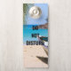 Do not disturb door hanger with an idyllic tropical beach scene. Turquoise blue crystal clear water and a soft brown sandy beach. Some palm leaves hanging down from above. An old wooden rowboat sits on the beach. A serene and peaceful landscape.
