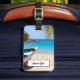 A luggage tag with an idyllic tropical beach scene. Turquoise blue crystal clear water and a soft brown sandy beach. Some palm leaves hanging down from above. An old wooden rowboat sits on the beach. A serene and peaceful landscape.