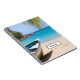 A notebook with an idyllic tropical beach scene. Turquoise blue crystal clear water and a soft brown sandy beach. Some palm leaves hanging down from above. An old wooden rowboat sits on the beach. A serene and peaceful landscape.