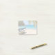 Post it notes with an idyllic tropical beach scene. Turquoise blue crystal clear water and a soft brown sandy beach. Some palm leaves hanging down from above. An old wooden rowboat sits on the beach. A serene and peaceful landscape.