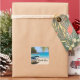 Thank you stickers with an idyllic tropical beach scene. Turquoise blue crystal clear water and a soft brown sandy beach. Some palm leaves hanging down from above. An old wooden rowboat sits on the beach. A serene and peaceful landscape.