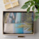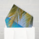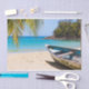 Tissue paper with an idyllic tropical beach scene. Turquoise blue crystal clear water and a soft brown sandy beach. Some palm leaves hanging down from above. An old wooden rowboat sits on the beach. A serene and peaceful landscape.