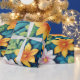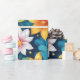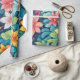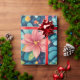 Beautiful tropical vibes floral pattern with light and dark pink and orange flowers on a dark blue background which has blue and green leaves. Nature inspired, bright, colourful wrapping paper.