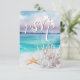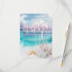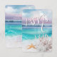 Pink and lavender sunrise sky with puffy clouds, the sunrise just beginning to reflect on the ocean waves. Pretty coral, open oyster with pearl inside accent this invitation design. Classy tropical seashore setting for that perfect beach wedding or destination island wedding.