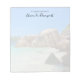 A notepad with a photograph of a turquoise blue ocean beach with big rocks scattered along the coast. Bright and sunny tropical locale. A semi-transparent layer placed on top to give the image a faded look, so you can easily write over top.