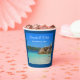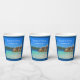 Paper cups with a photograph of a turquoise blue ocean beach with big rocks scattered along the coast. Bright and sunny tropical locale.
