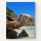 A personalised spiral notebook with a photograph of a turquoise blue ocean beach with big rocks scattered along the coast. Bright and sunny tropical locale.
