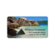 Address labels with a photograph of a turquoise blue ocean beach with big rocks scattered along the coast. Bright and sunny tropical locale.