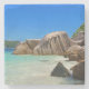A stone coaster with a photograph of a turquoise blue ocean beach with big rocks scattered along the coast. Bright and sunny tropical locale.