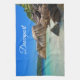 A kitchen towel with a photograph of a turquoise blue ocean beach with big rocks scattered along the coast. Bright and sunny tropical locale.