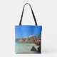 A tote bag with a photograph of a turquoise blue ocean beach with big rocks scattered along the coast. Bright and sunny tropical locale.