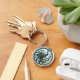 Elegant keychain with an image of a gorgeous Peacock with his tail spread. Image has a metallic look in shades of turquoise, blue and gold.