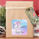 Business "thank you for your order" stickers with an image of a unicorn with big blue eyes, pink wings and a rainbow mane and tail. Kawaii cute.