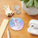 A key chain with an image of a unicorn with big blue eyes, pink wings and a rainbow mane and tail. Kawaii cute.