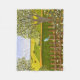 A fleece blanket with a beautiful image of a nature scene: A bird sitting on a weathered fence, wildflowers growing around the fence, a farmer on a tractor, working his land, trees with leaves, and farmland with various colours. Original artwork by W.B.