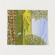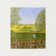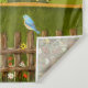 A tapestry with a beautiful image of a nature scene: A bird sitting on a weathered fence, wildflowers growing around the fence, a farmer on a tractor, working his land, trees with leaves, and farmland with various colours. Original artwork by W.B.