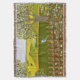 A fleece blanket with a beautiful image of a nature scene: A bird sitting on a weathered fence, wildflowers growing around the fence, a farmer on a tractor, working his land, trees fall leaves, and farmland of various colors. Original artwork by W.B.