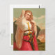 vintage painting portrait of a beautiful lady with long red hair, head band, white blouse, and long flowing red skirt with colourful decorations and ribbons and with a landscape background of rocks, mountains, and sky with people in the background sitting together, the lady is posing for the picture, with her hands touching her hair and an open pose