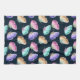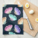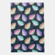 A kitchen towel with a beautiful pattern. Watercolor butterflies, painted in pastel colours including pink, purple, blue, yellow and green. Dark blue watercolor background.