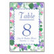 Want the latest, trendy wedding colours? These beautiful, watercolor hydrangeas are a mixture of purple violet to lavender, green, dark and light pink, and dark and light blue. They wrap around the table number card with various shades of green leaf foliage. Look close, each colourful mophead was created by hand and is very unique piece of art.