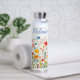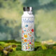 This beautiful water bottle features a garden of Summer Wildflowers. There is a template provided for you to put your name at the top. Flowers are red, orange, pink and blue with green leaves.