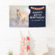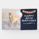 Party banner with a photograph of a gorgeous white horse. Running through a snow covered field. Majestic and beautiful.