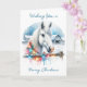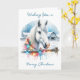 Personalised Christmas card. Wishing you a calm and cosy Christmas. Pretty watercolor white horse behind a rustic fence with a barn in the background on a snowy winter day.