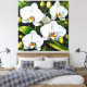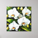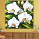 A detailed artwork of vibrant white orchids complemented by lush green foliage, displayed against a textured golden-brown background, showcasing the elegance and beauty of floral arrangements.