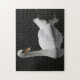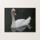 This awesome puzzle features a photograph of a beautiful white swan. The swan is a male mute swan, you can tell it is male by the black bump on the beak. The swan is gliding gracefully across the water on a calm lake.