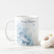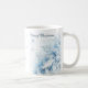 A beautiful pattern of winter fern frost on a window accompanied by snowflakes all in shades of blue and white.