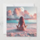 Beautiful woman meditating on a beach of white sand and shiny sea glass. Pink and blue fluffy clouds and pale blue water.