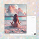 Beautiful woman meditating on a beach of white sand and shiny sea glass. Pink and blue fluffy clouds and pale blue water.