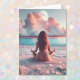 Beautiful woman meditating on a beach of white sand and shiny sea glass. Pink and blue fluffy clouds and pale blue water.