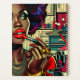 Cool ai art depicting a colourful comic style cartoon pretty African-American woman putting on lipstick in the kitchen, Retro style woman of colour.