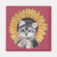 Unique painting of a beautiful Yorkshire Terrier Dog sitting in front of a sunflower on a burgundy background.