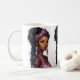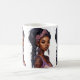 This image is a beautifully detailed portrait of a woman with a serene and confident expression. She has dark, voluminous hair styled in an elegant braid adorned with delicate pink flowers. Her striking eyes and subtle smile add to her captivating presence. She wears ornate, dangling earrings and a flowing garment with intricate lace patterns on the sleeves. The background is a soft gradient of purple and pink hues, which complements the overall aesthetic of the portrait.