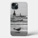 iPhone case featuring a black and white photo of a seagull resting on the beach as angry waves from Lake Michigan crash around St Joseph North Pier Inner and Outer Lighthouses.