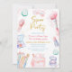 Sweet girl's spa party themed birthday invitation featuring a faux gold calligraphy heading, various beauty products, cucumber slices and mask. This spa party birthday invitation features a bathrobe on the back and is ideal for an upcoming spa birthday party.