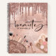 Modern, chic, trendy Rose Gold Beauty appointment book / notebook. Design features faux glitter drips, cosmetics and makeup icons with rose gold faux foil, sparkly glitter background and typography script. Personalise with your name on the front.