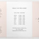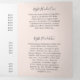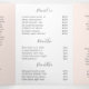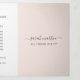 Elegant trifold brochure in blush pink and white featuring your business name with swashes in a grey handwritten script calligraphy on the front panel. The back panel has your hours of operation and contact information. The inner fold panel has two headers and text boxes. The inside has multiple templates for information about your business on the outer panels and a price list in the middle panel. This simple and feminine design is great for a makeup artist, hair stylist, lashes technician, beauty / nail salon or any woman owned business.