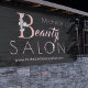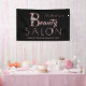 Beauty salon advertising banner sign with your custom business name in pink and black with fancy roses lettering typography over a solid black background.