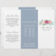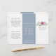 Elegant trifold brochure with a flower garland consisting of pastel pink and mauve roses along with your business name on the front panel. The back panel has your hours of operation and contact information over a dusty blue background. The inner fold panel has two headers and text boxes. The inside has multiple templates for information about your business on the outer panels and a price list in the middle panel. This floral design is great for a hair, nail or beauty salon or any woman owned business.