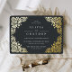 Elegant vintage wedding invitations in rich, inky off-black feature an ornately detailed deco border that evokes the look of cut paper in a papel picado style, rendered in striking gold foil.