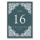 Art deco chic table number cards feature a forest green background adorned with lacy white papel picado style cutout detailing at the corners. Personalise with your names and wedding date, or name each table for an extra personal touch. Design repeats on reverse side. Coordinates with our Beaux Arts wedding invitation suite in Spruce.