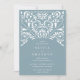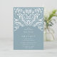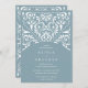 Elegant vintage wedding invitations in dusty blue with a touch of aqua feature ornate detailing that evokes the look of cut paper in a papel picado style.