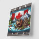 A beaver constructs a dam by a riverbank, surrounded by trees and mountains, with a Canadian flag prominently displayed in the background.